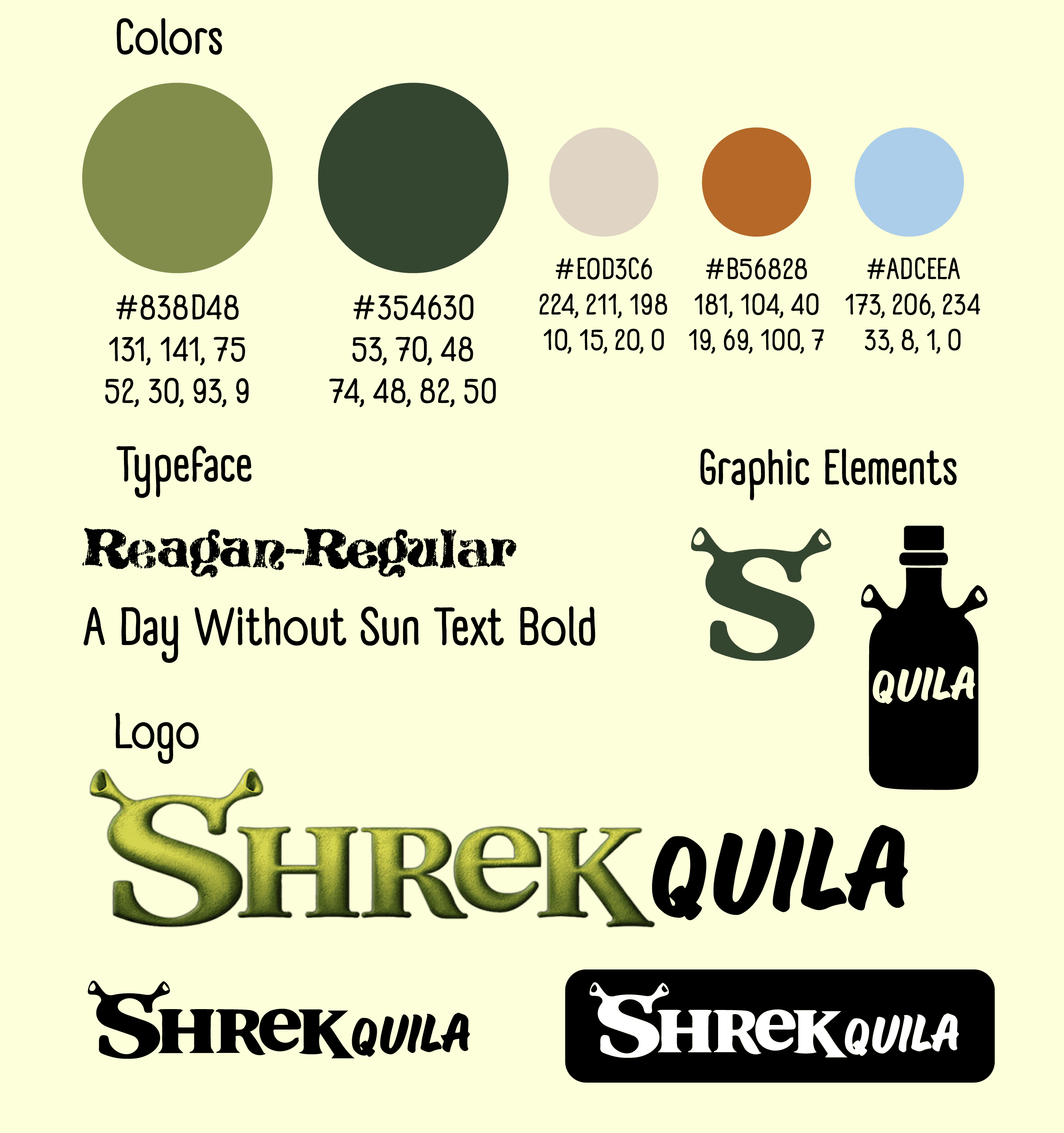 i selected a color palette directly from the shrek movies, and a primary type face that is playful, yet still modern, putting a heavy emphasis on the logo to really show that this is shrek’s tequila brand. the brand kit shows the shrek taking over a new realm, with clear influence from the original dreamwork’s shrek. it is consistent and will generate enthusiasm for the new product, while igniting the undying and unwavering love for shrek in older generations.