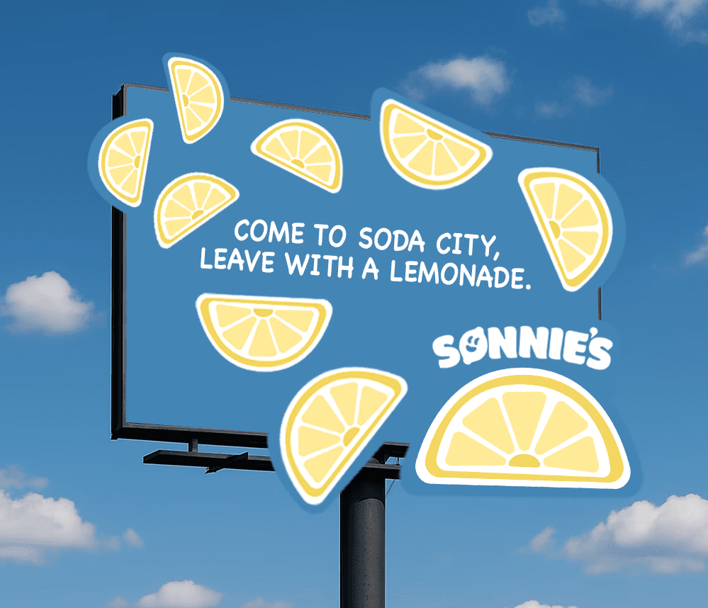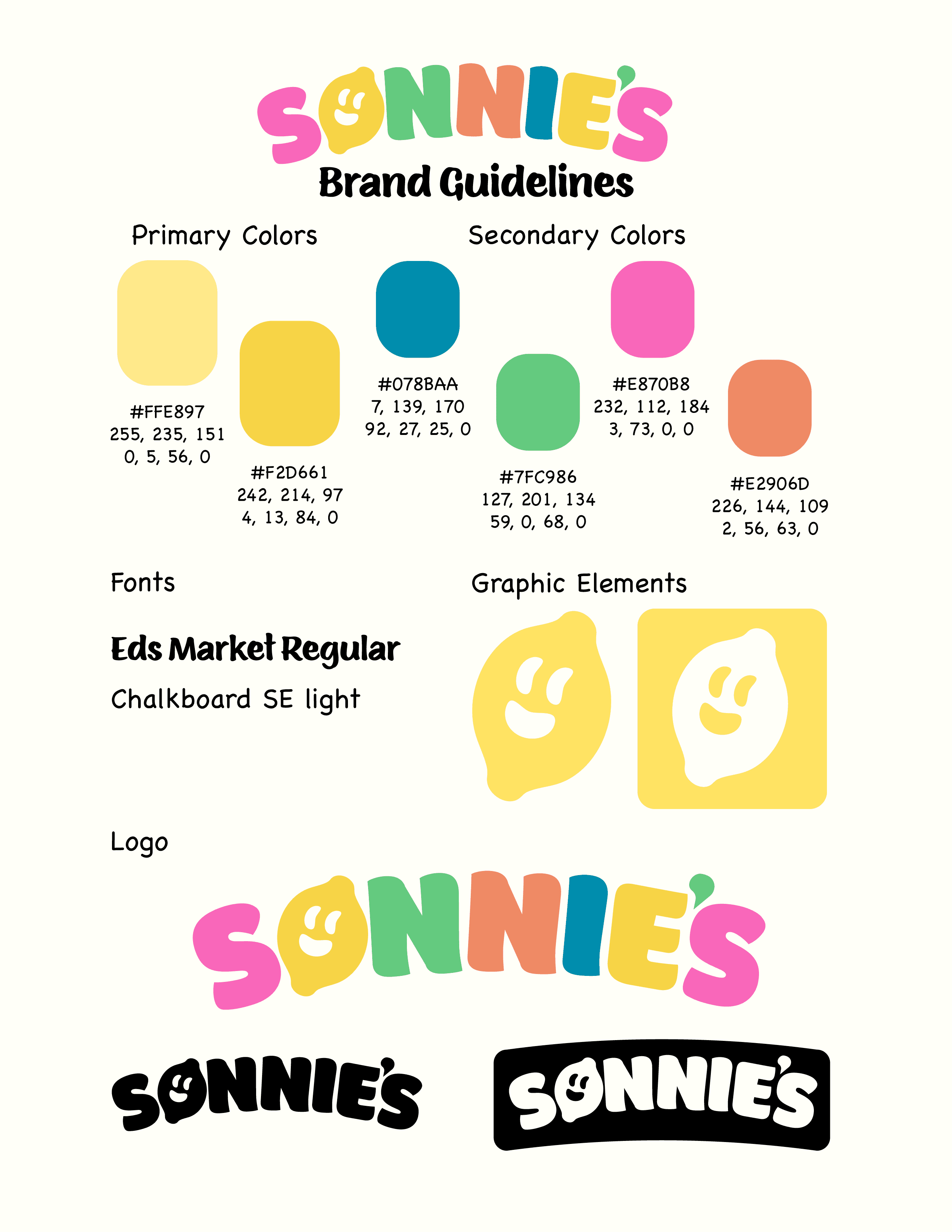 to do this, i created a color palette based off of the original signage used on their lemonade trailer. i selected a primary and secondary font that complimented each other, but still had a handwritten feel to it. then, i modernized the logo to be scalable and used across physical displays. the finished rebrand creates uniformity and room for sonnie’s to expand and modernize, with a strong emphasis on their roots.